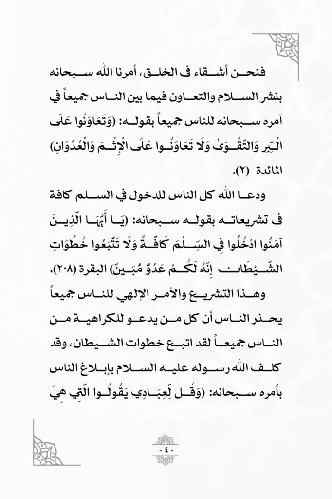 ودعا الله كل الناس للدخول في السلم كافة فى تشريعاته بقوله سبحانه: (يَا أَيُّهَا الَّذِينَ آمَنُوا ادْخُلُوا فِي السِّلْمِ كَافَّةً وَلَا تَتَّبِعُوا خُطُوَاتِ الشَّيْطَانِ ۚ إِنَّهُ لَكُمْ عَدُوٌّ مُّبِينٌ) البقرة (٢٠٨).