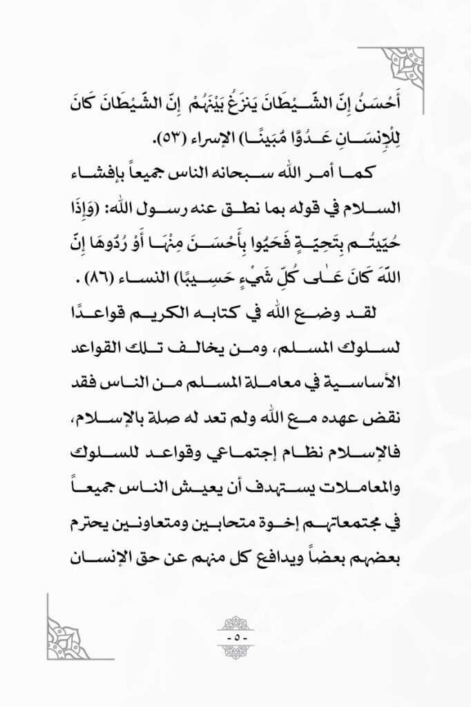 كما أمر الله سبحانه الناس جميعاً بإفشاء السلام في قوله بما نطق عنه رسول الله: (وَإِذَا حُيِّيتُم بِتَحِيَّةٍ فَحَيُّوا بِأَحْسَنَ مِنْهَا أَوْ رُدُّوهَا ۗ إِنَّ اللَّهَ كَانَ عَلَىٰ كُلِّ شَيْءٍ حَسِيبًا) النساء (٨٦) .
