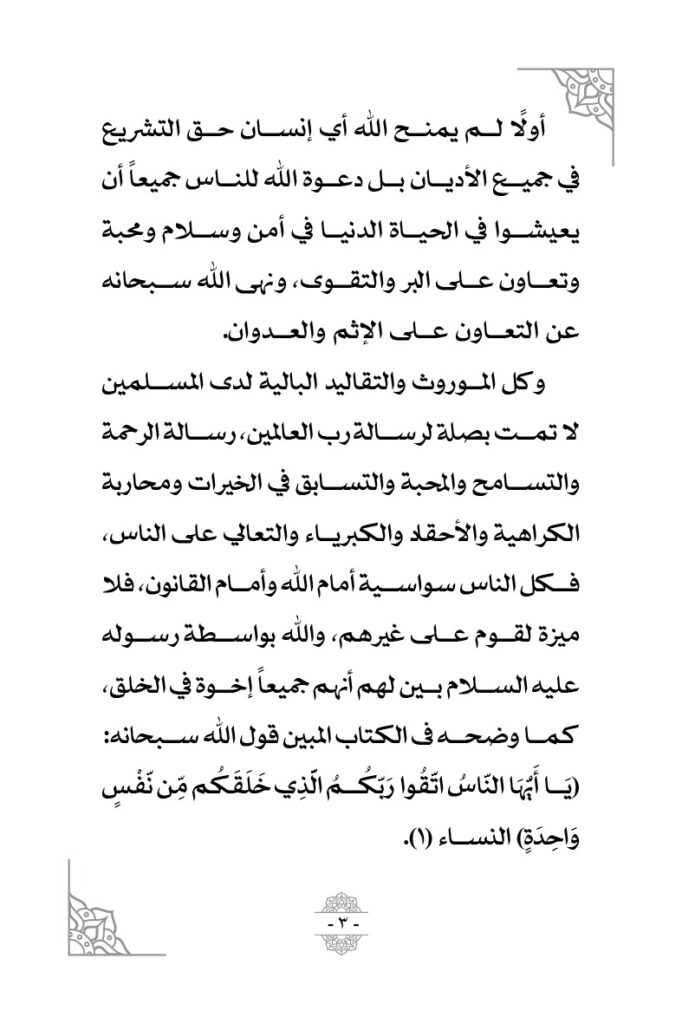 أولًا لم يمنح الله أي إنسان حق التشريع في جميع الأديان بل دعوة الله للناس جميعاً أن يعيشوا في الحياة الدنيا في أمن وسلام ومحبة وتعاون على البر والتقوى، ونهى الله سبحانه عن التعاون على الإثم والعدوان.