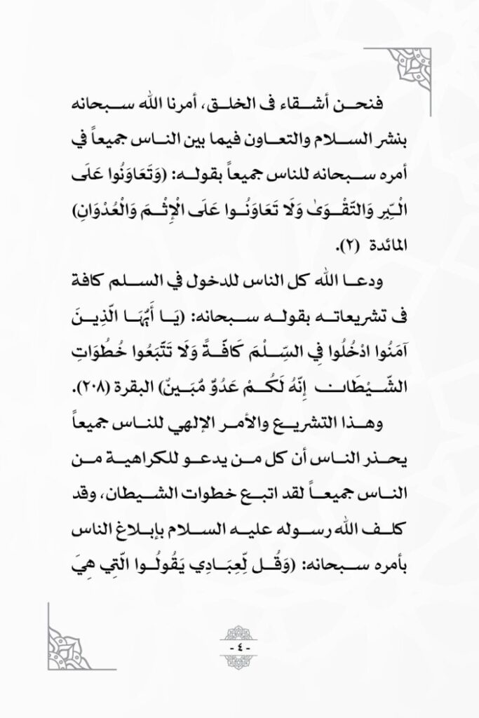 ودعا الله كل الناس للدخول في السلم كافة فى تشريعاته بقوله سبحانه: (يَا أَيُّهَا الَّذِينَ آمَنُوا ادْخُلُوا فِي السِّلْمِ كَافَّةً وَلَا تَتَّبِعُوا خُطُوَاتِ الشَّيْطَانِ ۚ إِنَّهُ لَكُمْ عَدُوٌّ مُّبِينٌ) البقرة (٢٠٨).