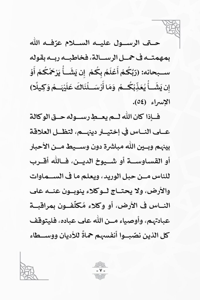 حتى الرسول عليه السلام عرَّفه الله بمهمته فى حمل الرسالة، فخاطبه ربه بقوله سبحانه: (رَّبُّكُمْ أَعْلَمُ بِكُمْ ۖ إِن يَشَأْ يَرْحَمْكُمْ أَوْ إِن يَشَأْ يُعَذِّبْكُمْ ۚ وَمَا أَرْسَلْنَاكَ عَلَيْهِمْ وَكِيلًا) الإسراء (٥٤).