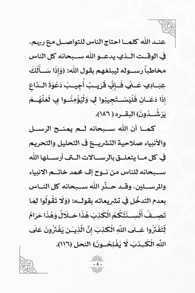 كما أن الله سبحانه لم يمنح الرسل والأنبياء صلاحية التشريع فى التحليل والتحريم في كل ما يتعلق بالرسالات التى أرسلها الله سبحانه للناس من نوح إلى محمد خاتم الانبياء والمرسلين، وقد حذَّر الله سبحانه كل الناس بعدم التدخُّل في تشريعاته بقوله: (وَلَا تَقُولُوا لِمَا تَصِفُ أَلْسِنَتُكُمُ الْكَذِبَ هَٰذَا حَلَالٌ وَهَٰذَا حَرَامٌ لِّتَفْتَرُوا عَلَى اللَّهِ الْكَذِبَ ۚ إِنَّ الَّذِينَ يَفْتَرُونَ عَلَى اللَّهِ الْكَذِبَ لَا يُفْلِحُونَ) النحل (١١٦).