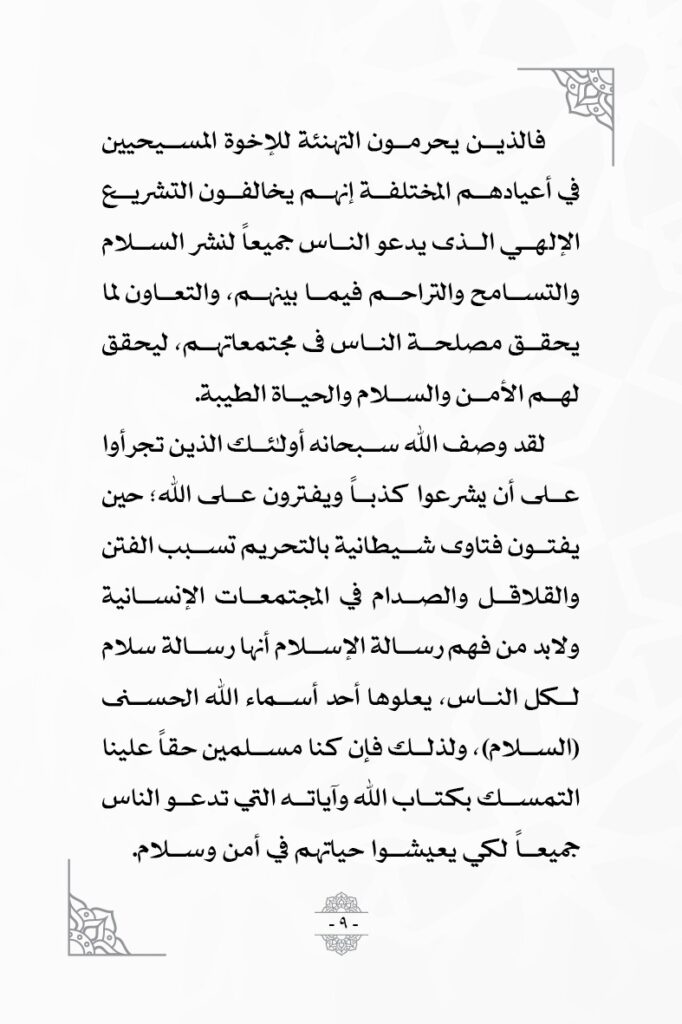 فالذين يحرمون التهنئة للإخوة المسيحيين في أعيادهم المختلفة إنهم يخالفون التشريع الإلهي الذى يدعو الناس جميعاً لنشر السلام والتسامح والتراحم فيما بينهم، والتعاون لما يحقق مصلحة الناس فى مجتمعاتهم، ليحقق لهم الأمن والسلام والحياة الطيبة.